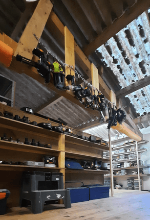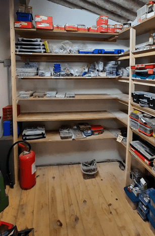 After first clearing out the area of tools on the mezzaine we built an extension on the first floor with shelving and safety rails. Next we installed kit shelves for the large power tools and used the bespoke shelving and racks for battery tools, nails, scews, drill bits, ironmongery etc., there is a designated section for everything,