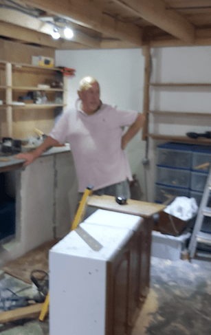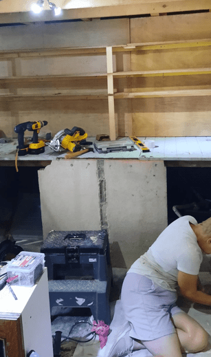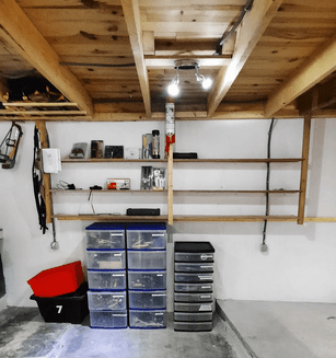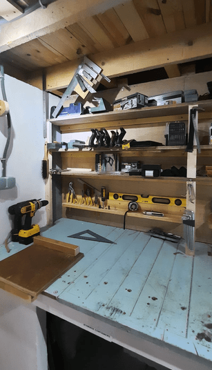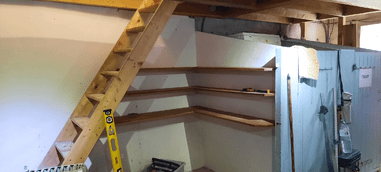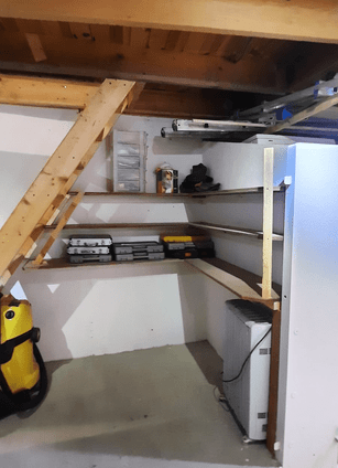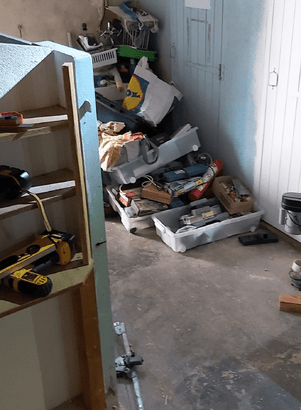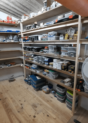 Next, we cleared the ground floor ready for remodelling and utilizing the space. We painted walls built new shelves, completly dismantled, remodelled and rebuilt the work bench. Re-organised, labelled shelves and drawers and sored everything in its place