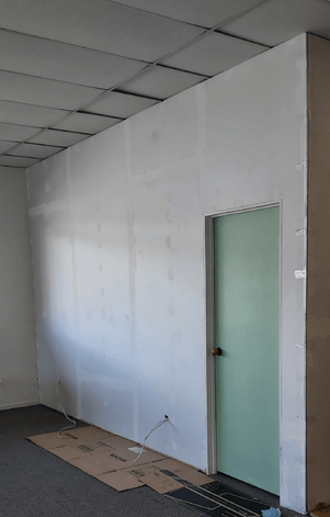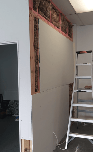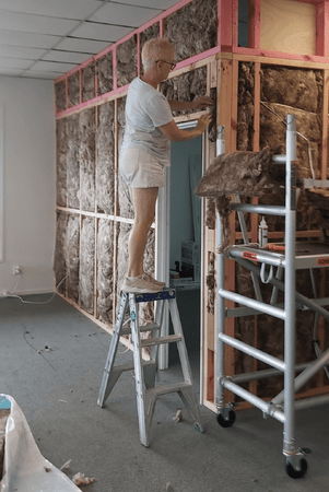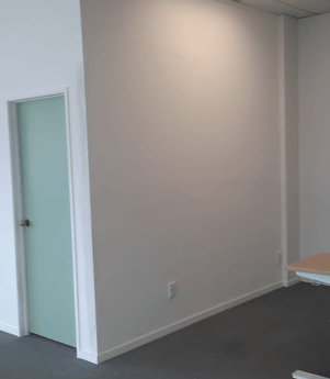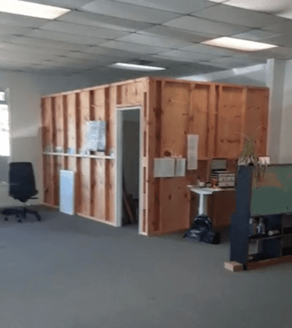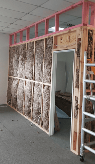 We built the walls up to the ceiling, insulated for sound proofing , boarded and painted inside and out to create a smart office for sales staff to chat to potential customers