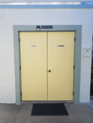 Before and After - New door frame, hinges replaced, new signage and paint work on doors and surround.